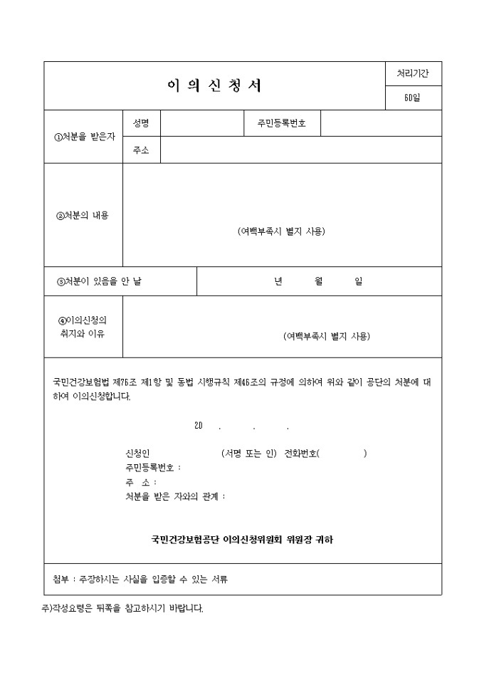9,000원/월국민건강보험법 제76조 제1항 및 동법 시행규칙 제46조의 규정에 의하여 위와 같이 공단의 처분에 대하여 이의신청을 할 때 사용하는 건강 보험 이의신청서 양식입니다.