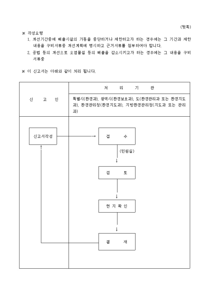 대기환경보전법시행령 제13조제4항 및 동법시행규칙 제35조의2제1항의 규정에 의한 배출시설(방지시설)에 대하여 자체개선계획서를 제출할 때 사용하는 "배출,방시 시설 자체 개선계획서" 양식입니다.