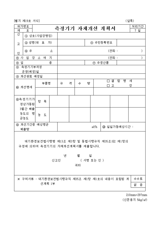9,000원/월대기환경보전법시행령 제13조 제3항 및 동법시행규칙 제35조의2 제1항의 규정에 의하여 측정기기의 자체개선계획서를 제출할 때 사용하는 "측정기기 자체개선 계획서" 양식입니다.
