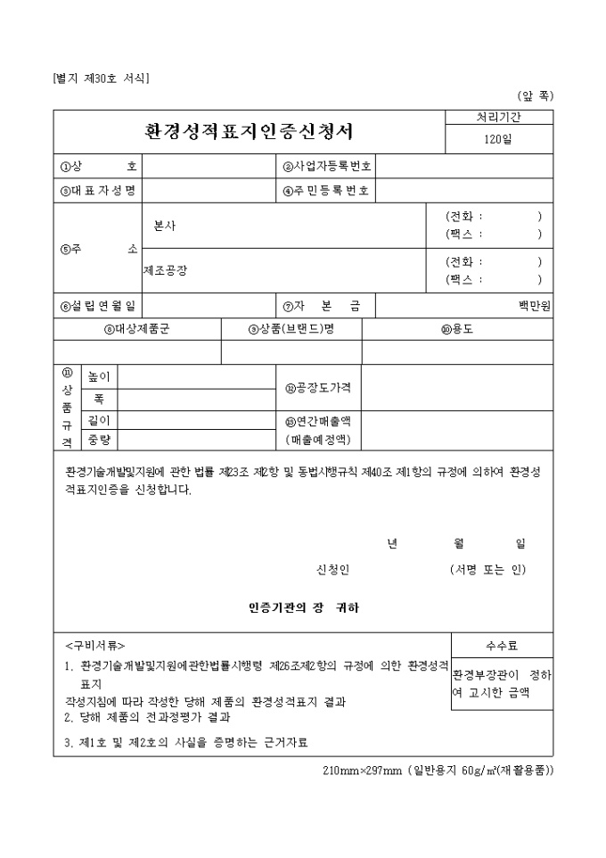 9,000원/월환경기술개발 및 지원에 관한 법률 제23조 제2항 및 동법시행규칙 제40조 제1항의 규정에 의하여 환경성적표지인증을 신청할 때 사용하는 환경성적 표지 인증신청서 양식입니다.