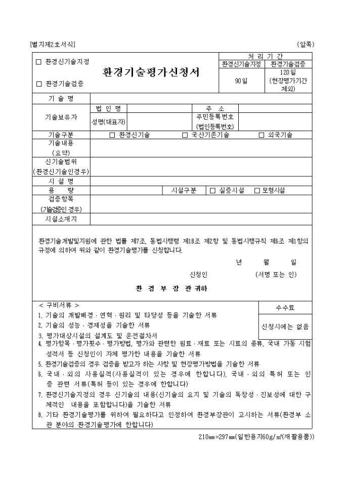 9,000원/월환경기술개발및지원에 관한 법률 제7조, 동법시행령 제18조 제2항 및 동법시행규칙 제6조 제1항의 규정에 의하여 위와 같이 환경기술평가를 신청할 때 사용하는 "환경 신기술 지정,검증 환경기술 평가신청서" 양식입니다.