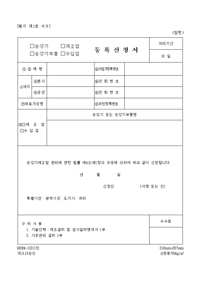9,000원/월승강기제조및 관리에 관한 법률 제4조제1항의 규정에 의하여 위와 같이 신청하고자 할 때 사용하는 "(승강기 부품 제조업,수입업) 등록신청서" 양식입니다.