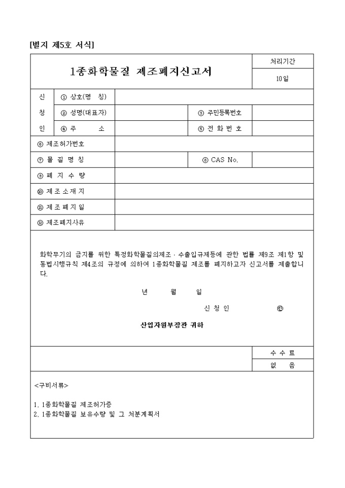 화학무기의 금지를 위한 특정화학물질의제조․수출입규제등에 관한 법률 제9조 제1항 및 동법시행규칙 제4조의 규정에 의하여 1종화학물질 제조를 폐지하고자 신고할 때 사용하는 "1종 화학물질 제조 폐지신고서" 양식입니다.