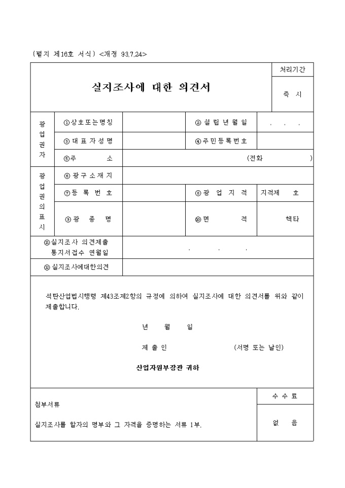 9,000원/월석탄산업법시행령 제43조제2항의 규정에 의하여 실지조사에 대한 의견서를 위와 같이 제출할 때 사용하는 "실지조사에 대한 의견서" 양식입니다.