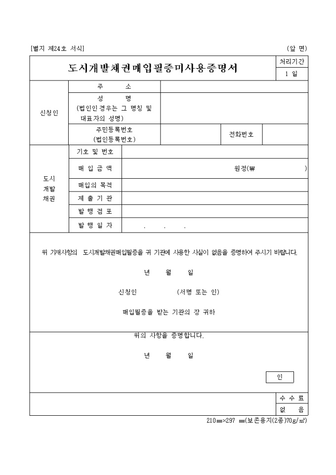9,000원/월도시개발 채권 매입필증을 귀 기관에 사용한 사실이 없음을 증명할 때 쓰이는 도시개발 채권 매입필증 미사용증명서 양식입니다.