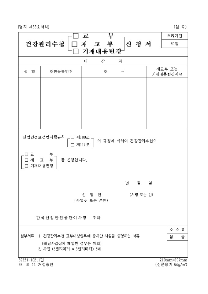 9,000원/월산업 안전보건법 시행규칙 □ 제109조, □ 제114조 의 규정에 의하여 건강관리수첩의 (교부, 재교부, 기재내용변경)을 신청할 때 사용하는 "건강 관리수첩의 (교부, 재교부, 기재내용변경) 신청서" 양식입니다.