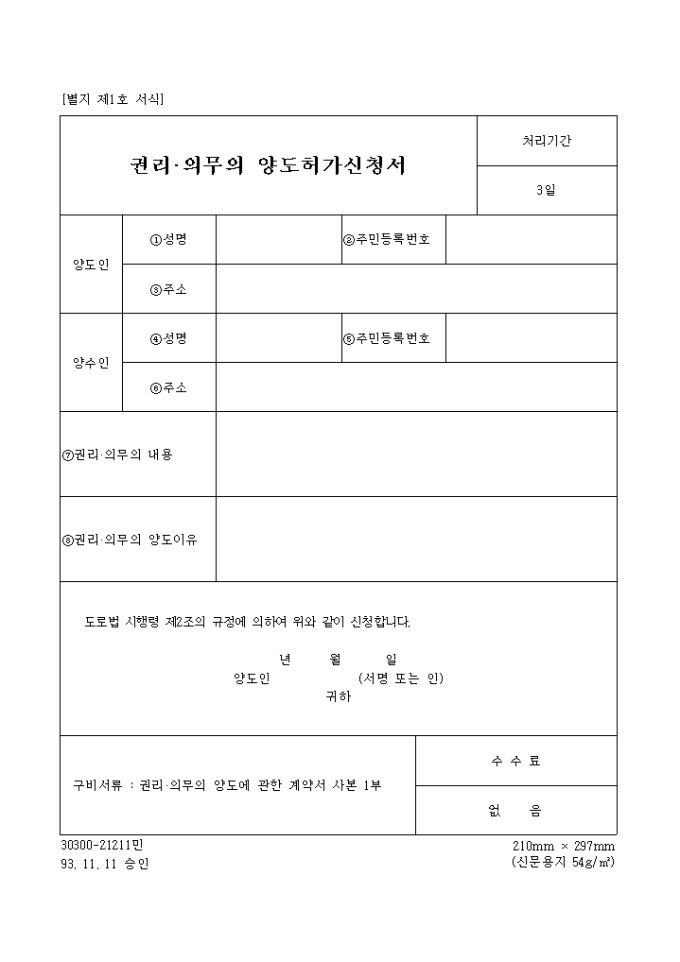 권리,의무의 양도 허가신청서 양식입니다.