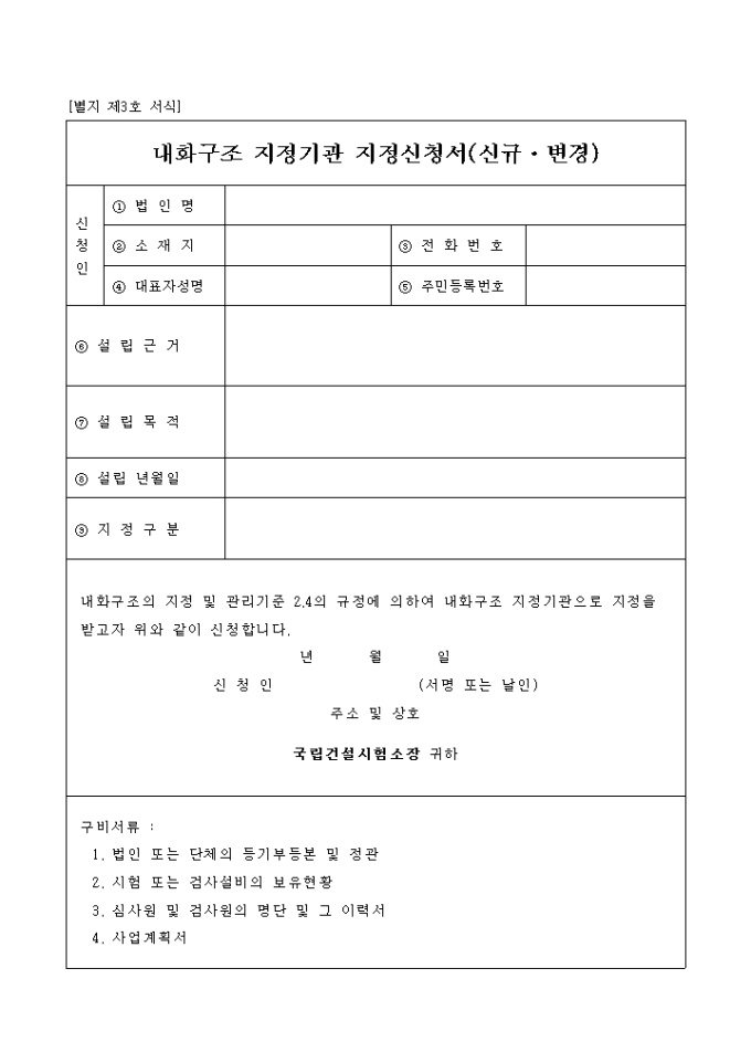 9,000원/월내화구조 지정기관 지정신청서(신규,변경) 양식입니다.