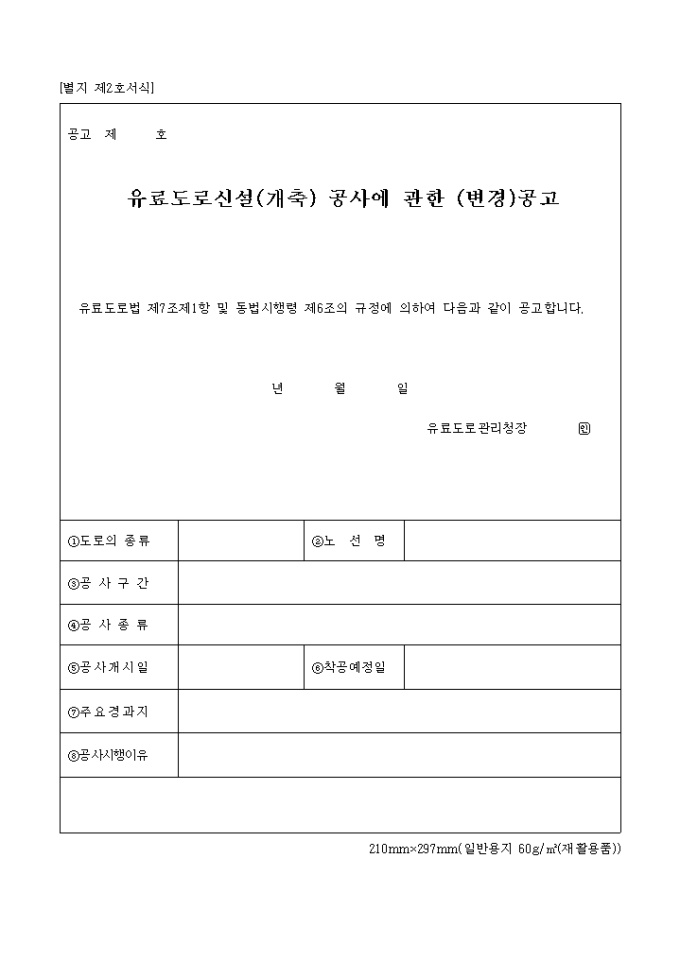 유료도로법 제7조제1항 및 동법시행령 제6조의 규정에 의하여 다음과 같이 공고하실때 사용하는 양식입니다.
