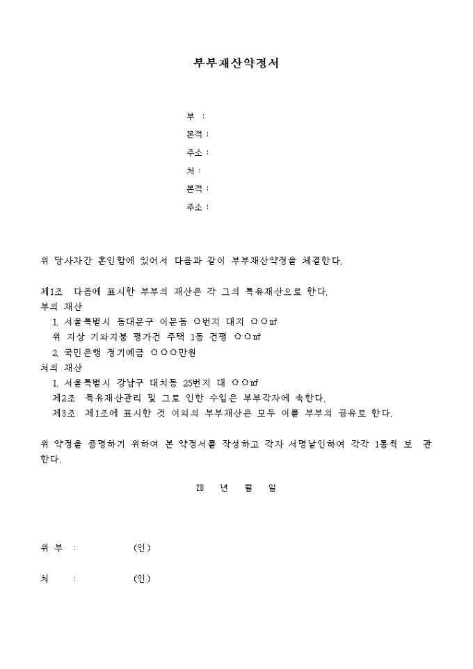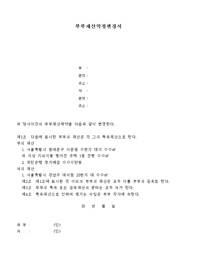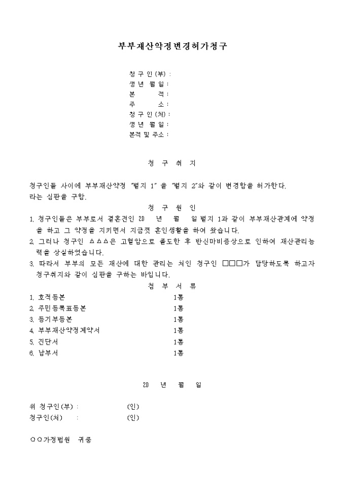 9,000원/월청구인들 사 이에 부부재산약정을 명시한 내용과 같이 변경함을 허가요청할 때 사용하는 양식입니다. 명시한 내요으로 부부재산약정서, 부부재산약정변경서등이 첨부되어 있습니다.