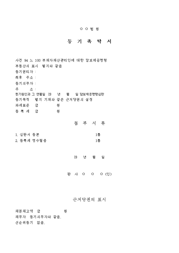 근저당권의 설정을 위한 등기 촉탁서 양식입니다.