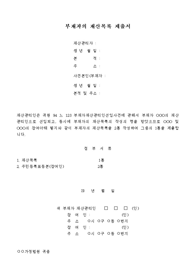 9,000원/월재산관리인은 부재자 재산관리인 선임사건에 관해서 부재자의 재산관리인으로 선임되고, 동시에 부재자의 재산목록의 작성의 명을 받았으므로 그에 대한 부재자의 재산목록을 제출할 때 사용하는 양식입니다.