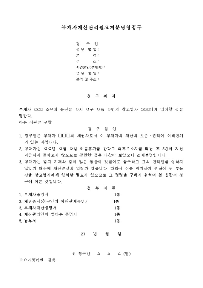 부재자재산관리에 관한필요처분명령청구서