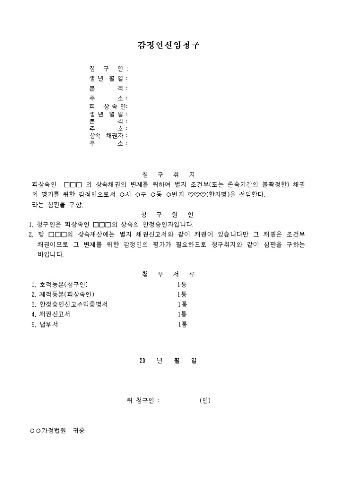 9,000원/월피상속인의 상속채권의 변제를 위하여 채권의 평가를 위한 감정인으로서 특정인의 선임을 요청할 때 사용하는 양식입니다.