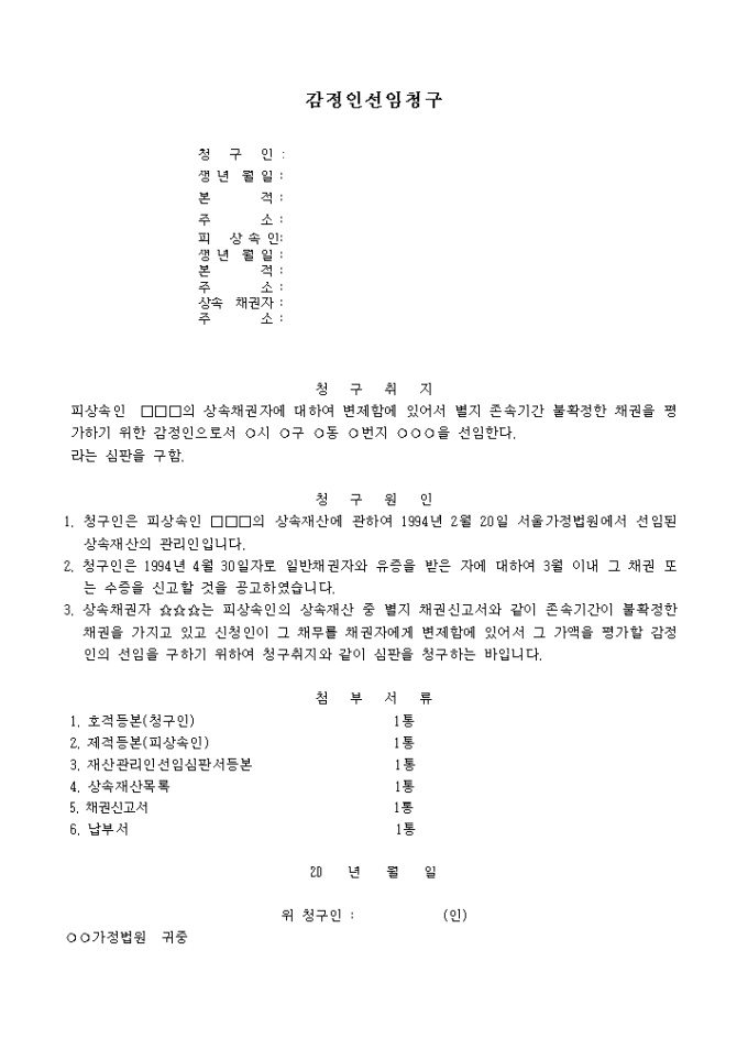 9,000원/월피상속인의 상속채권자에 대하여 변제함에 있어서 존속기간 불확정한 채권을 평가하기 위한 감정인으로서 명시된 특정인의 선임을 요청할 때 사용하는 양식입니다.