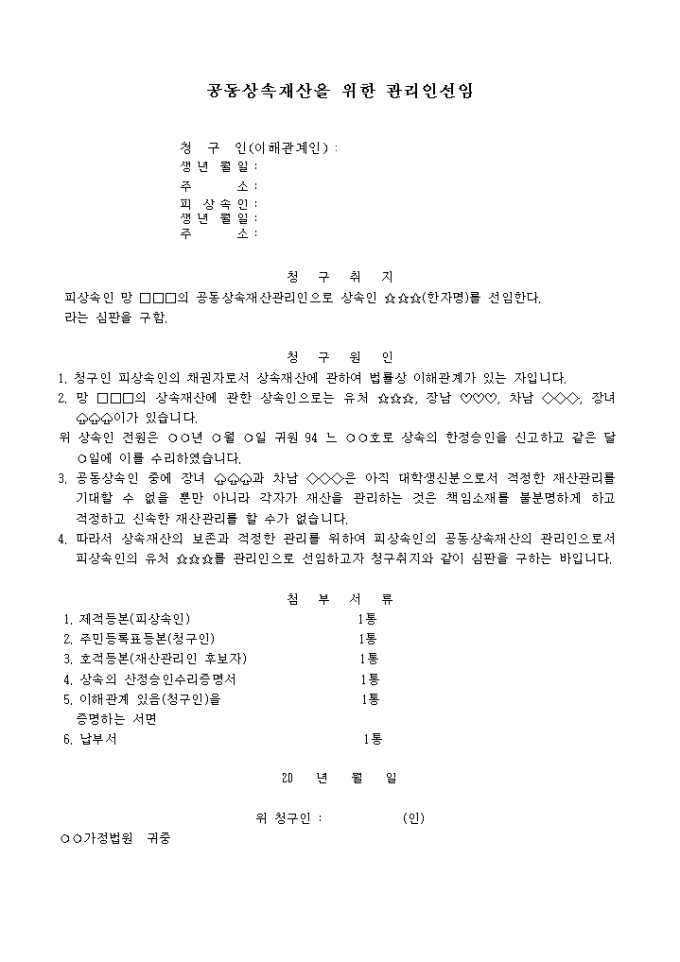 민법 제1040조 제1항의 규정에 의하여 피상속인의 공동상속재산관리인으로 상속인을 선임할 것을 요청하는 양식입니다.