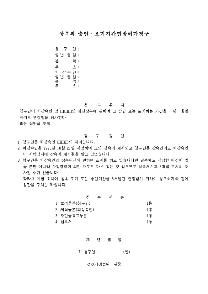 청구인이 피상속인의 재산상속에 관하여 그 승인 또는 포기하는 기간을 명시된 기간으로 연장할것을 요청하는 양식입니다.