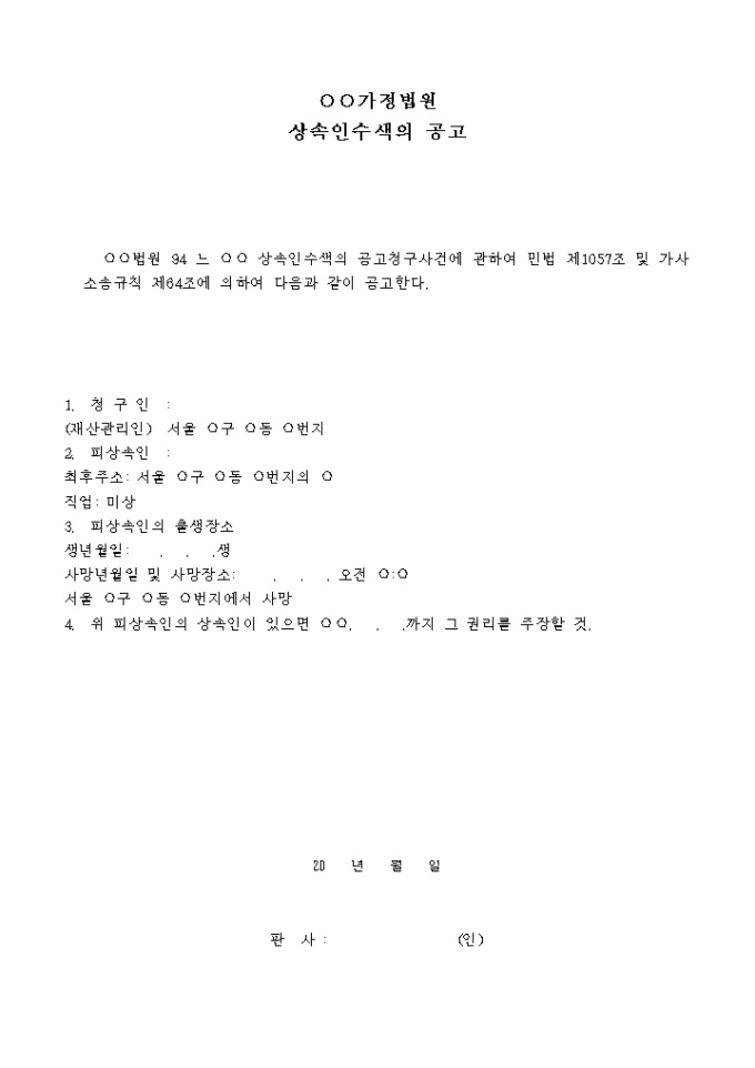상속인수색의 공고청구사건에 관하여 민법 제1057조 및 가사소송규칙 제64조에 의하여 공고할 때 사용하는 양식으로 공고내용을 작성하게 되어 있습니다.