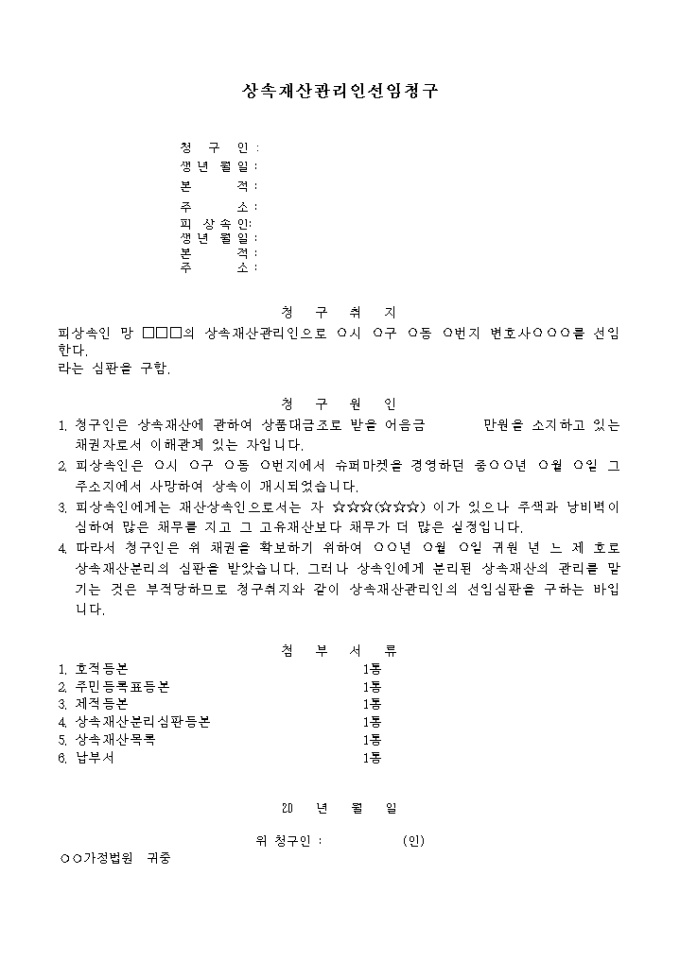 9,000원/월피상속인의 상속재산관리인으로 명시한 특정 변호사를 선임하고 이를 요청할 때 사용하는 양식입니다.
