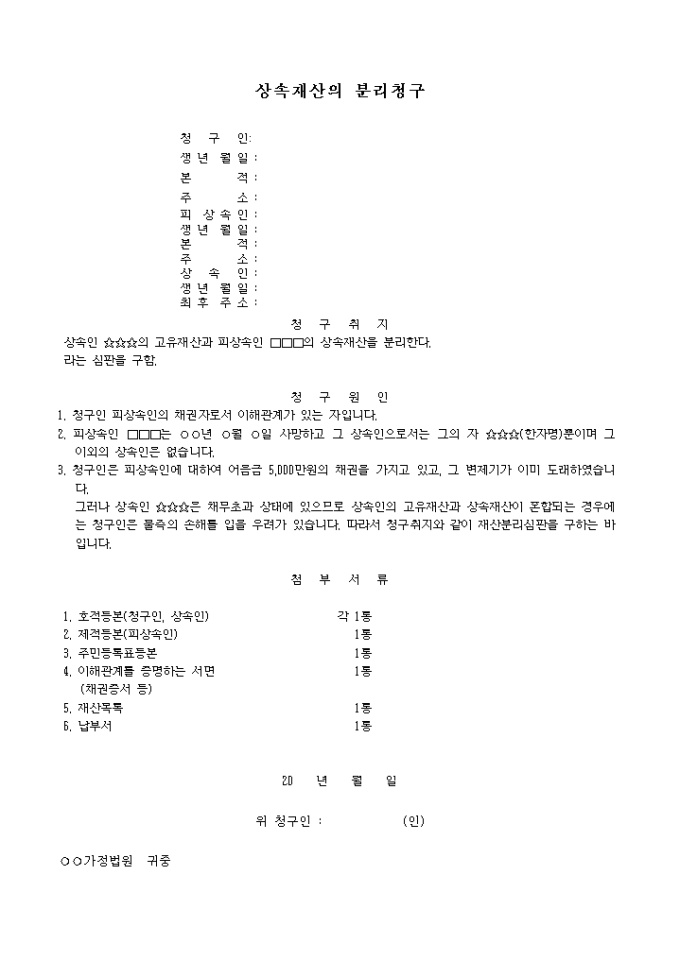 상속인의 고유재산과 피상속인의 상속재산의 분리를 요청할 때 사용하는 양식입니다.