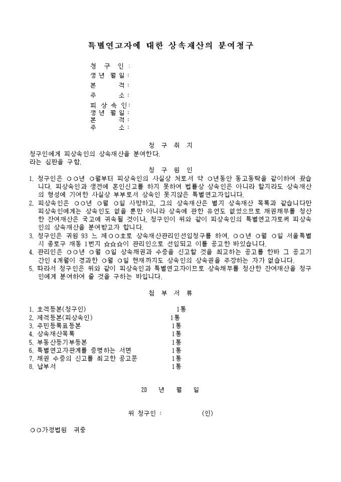 9,000원/월청구인에게 피상속인의 상속재산을 분여할 경우 이에 대한 심판을 구할 때 사용하는 양식입니다.