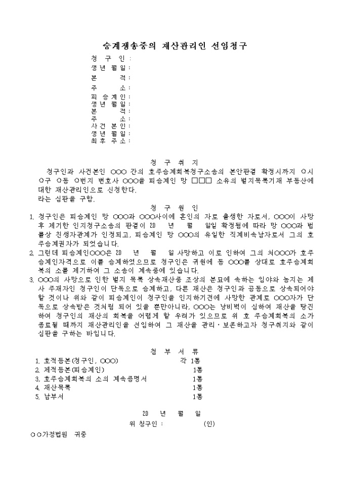 청구인과 사건본인간의 호주승계회복청구소송의 본안판결 확정시까지 변호사 OOO을 피승계인 소유의 별지목록기재 부동산에 대한 재산관리인으로 의 신청을 요청할 때 사용하는 양식입니다.
