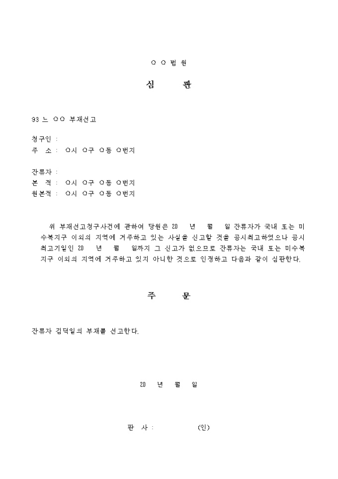 부재선고청구사건에 관하여 잔류자가 국내 또는 미수복지구 이외의 지역에 거주하고 있는 사실을 신고할 것을 공시최고하였으나 공시최고기일까지 그 신고가 없으므로 잔류자는 국내 또는 미수복지구 이외의 지역에 거주하고 있지 아니한 것으로 인정하고 그에 대한 심판을 할 때 사용하는 양식입니다.