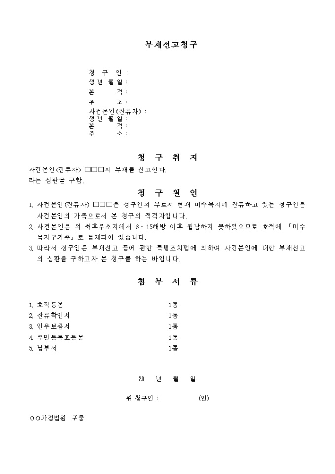 9,000원/월사건본인(잔류자)의 부재를 선고를 요청할 때 사용하는 양식입니다.