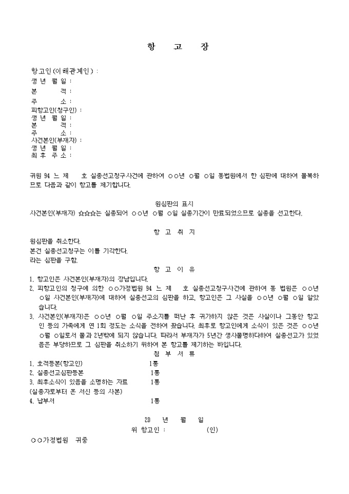 9,000원/월실종선고청구사건에 관하여 동법원에서 한 심판에 대하여 불복하므로 그에 대한 항고를 제기할 때 사용하는 양식입니다.