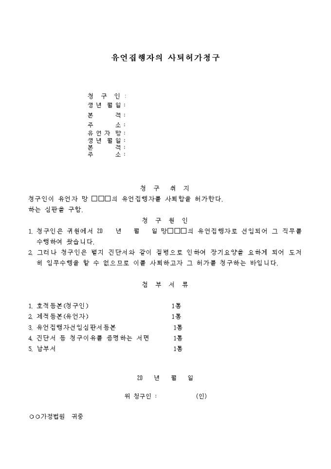 유언집행자의사퇴 허가청구서