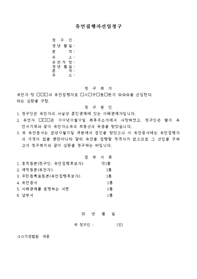 9,000원/월유언자의 유언집행자로 명시된 특정인을 선임할 때 사용하는 청구서 양식입니다.