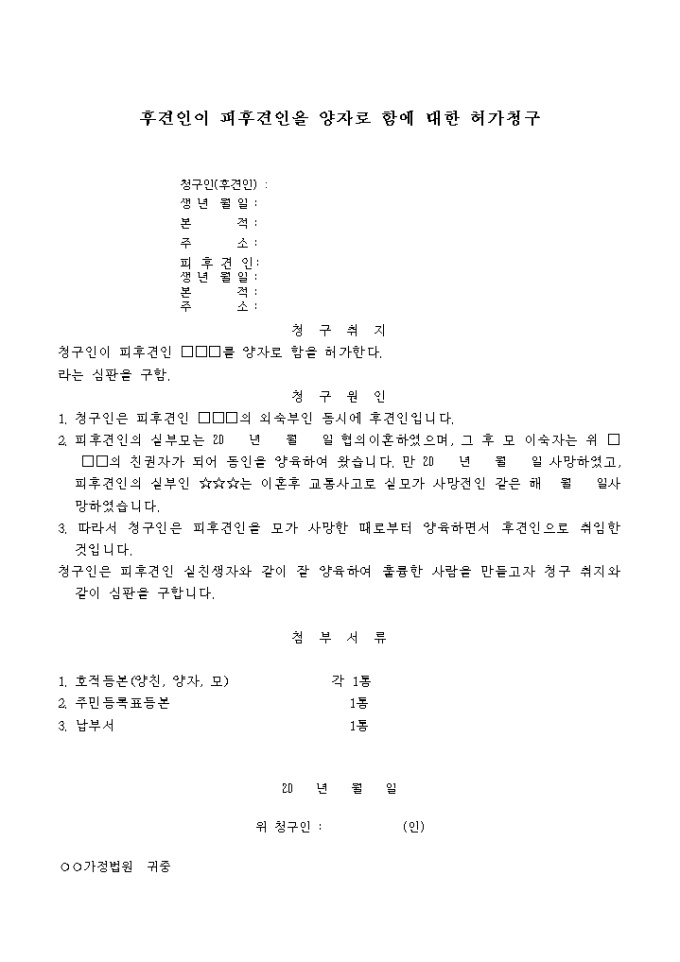 9,000원/월청구인이 피후견인을 양자로 함을 허가요청할 때 사용하는 신청서 양식입니다.