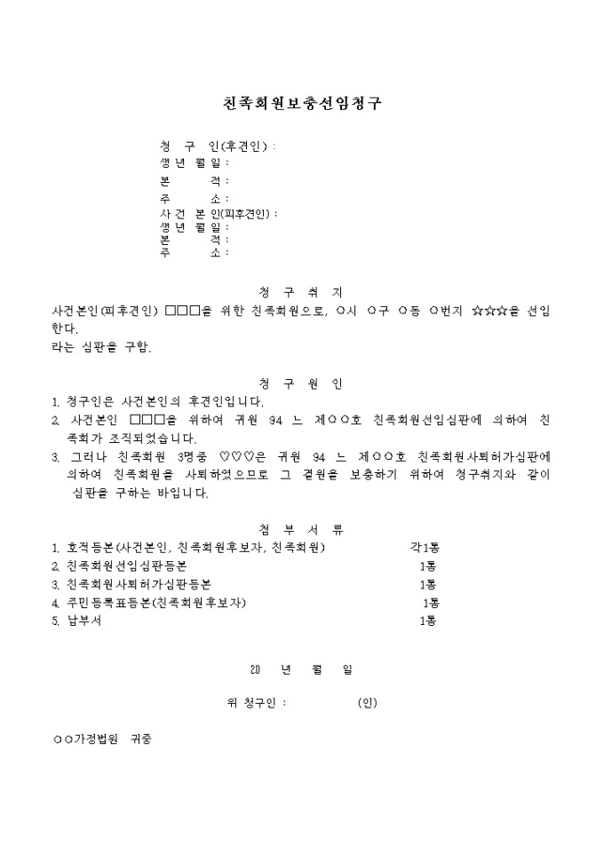 사건본인(피후견인)을 위한 친족회원으로,기재된 특정인을 선임요청할 때 사용하는 양식입니다.