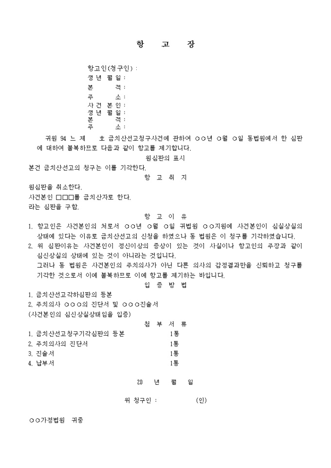 금치산선고청구사건에 관하여 법원에서 한 심판에 대하여 불복하여 항고를 제기할 때 사용하는 양식입니다.