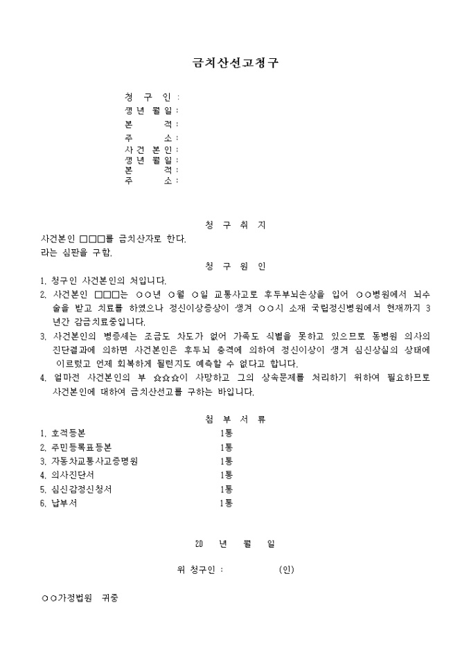 9,000원/월사건본인을 금치산자로 요청할 경우 사용하는 청구서 양식입니다. 라는 심판을 구함.