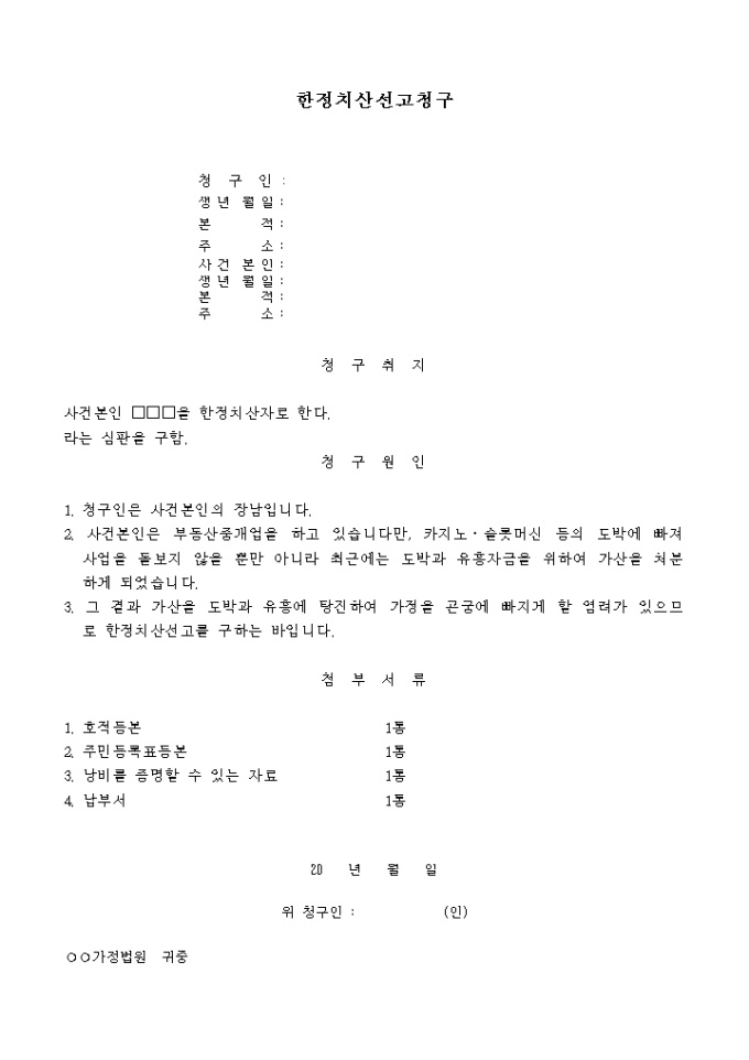 9,000원/월사건본인을 한정치산자로 요청할 때 사용하는 양식입니다.