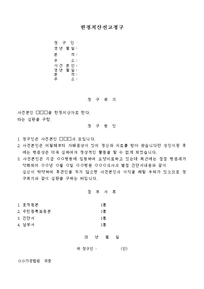 심신박약으로 인한 경우 사건본인을 한정치산자로 요청할 때 사용하는 양식입니다.
