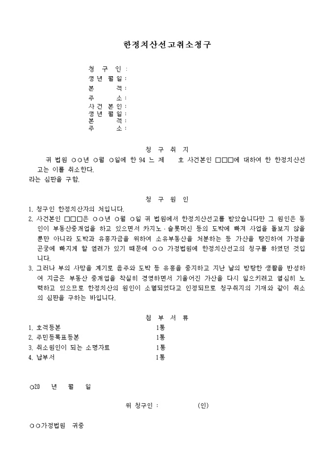 한정치산선고 취소청구서