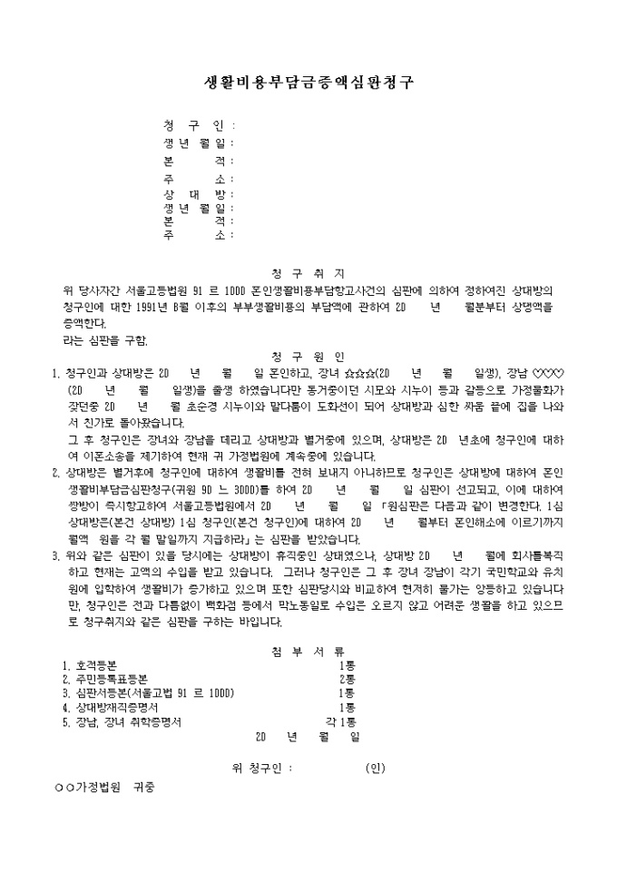 당사자간 혼인생활비용부담항고사건의 심판에 의하여 정하여 진 상대방의 청구인에 대한 부부생활비용의 부담액에 관하여 특정일부터 상댕액을 증액함을 요청하는 청구서 양식입니다.