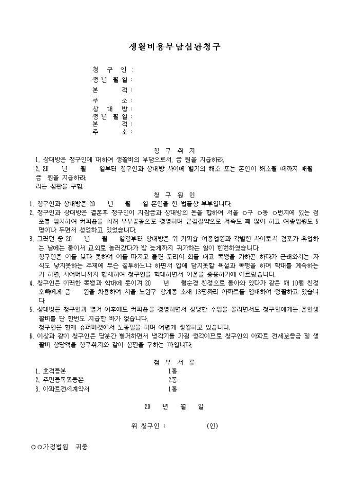 부부의생활비용부담심판 청구서