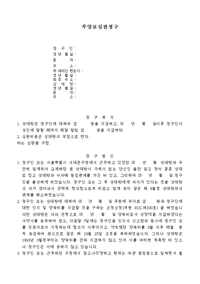 부양료심판청구서(노부모로부터 성숙한자에 대해 청구하는 경우)