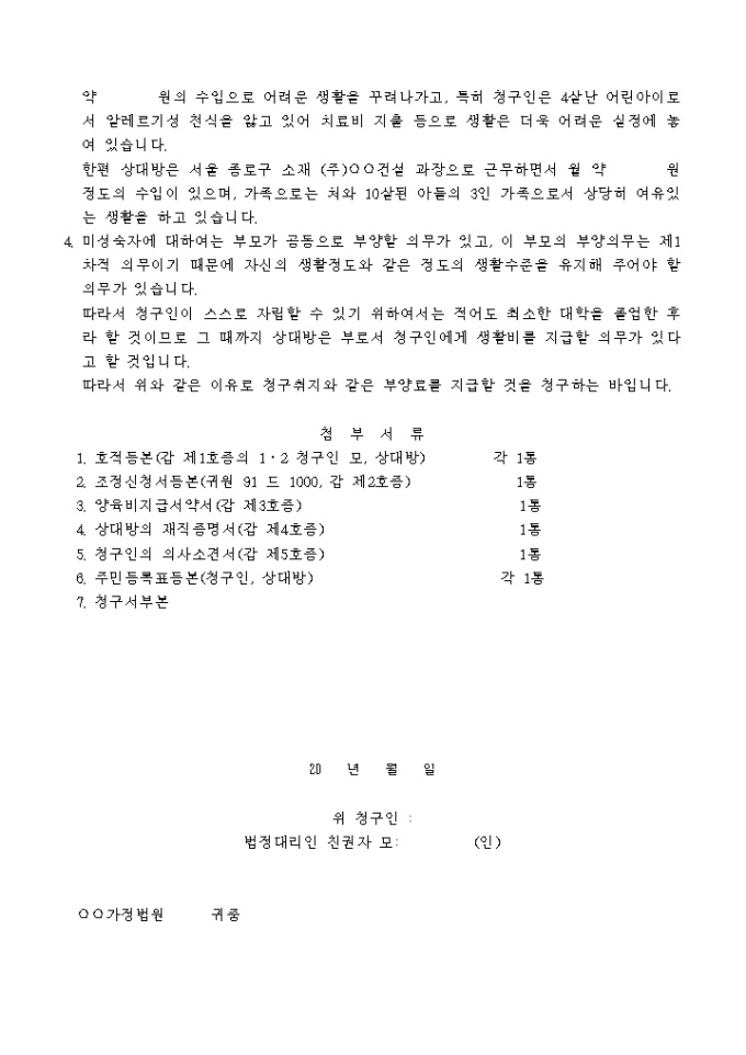 부양료심판청구서(미성숙자가인지한부에 대한 부양료청구하는경우)
