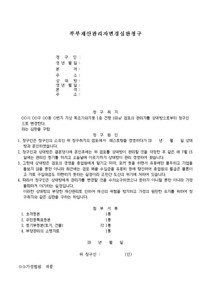 지상 목조기와지붕 점포의 관리자를 상대방으로 부터 청구인으로 변경요청할 경우 사용하는 청구서 양식입니다.