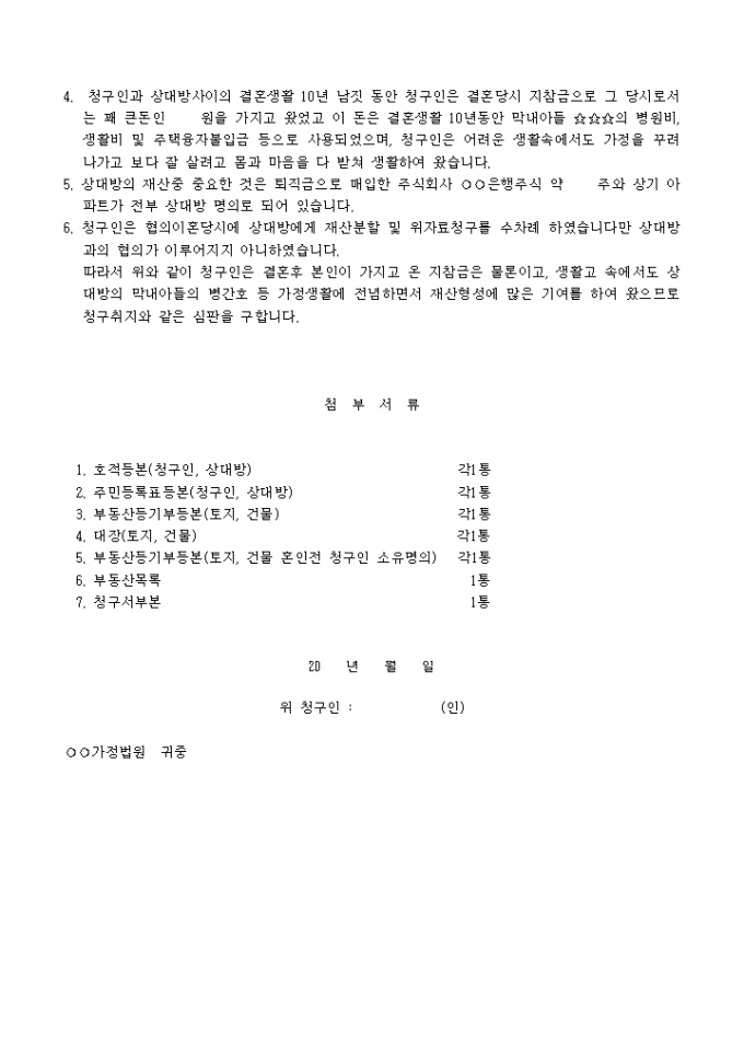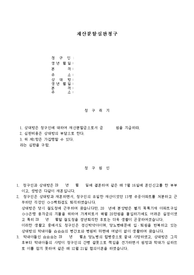 9,000원/월(가사에 종사한 처로부터 청구하는 경우)상대방은 청구인에 대하여 재산분할금으로서 일정금액의 지급을 요청하는 양식입니다.