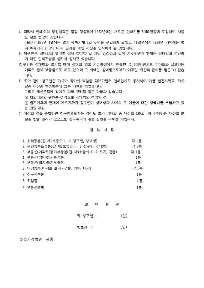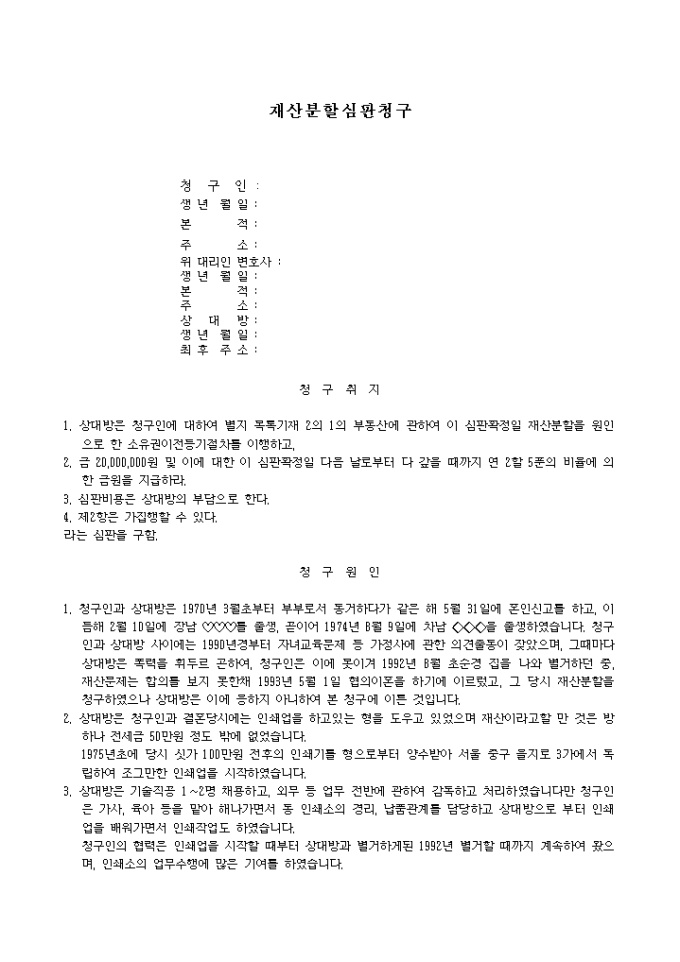 9,000원/월(가업에 종사한 처로부터 청구하는 경우)상대방은 청구인에 대하여 별지 목록기재된 부동산에 관하여 이 심판확정일 재산분할을 원인으로 한 소유권이전등기절차를 이행함을 요청하는 청구서 양식입니다.