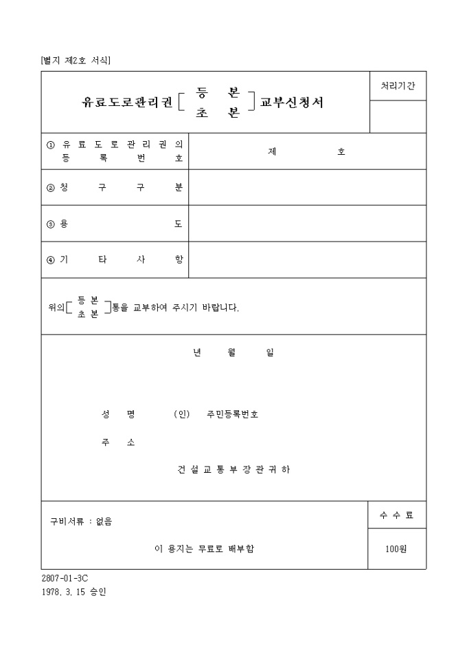 유료도로관리권(등본, 초본)교부신청서
