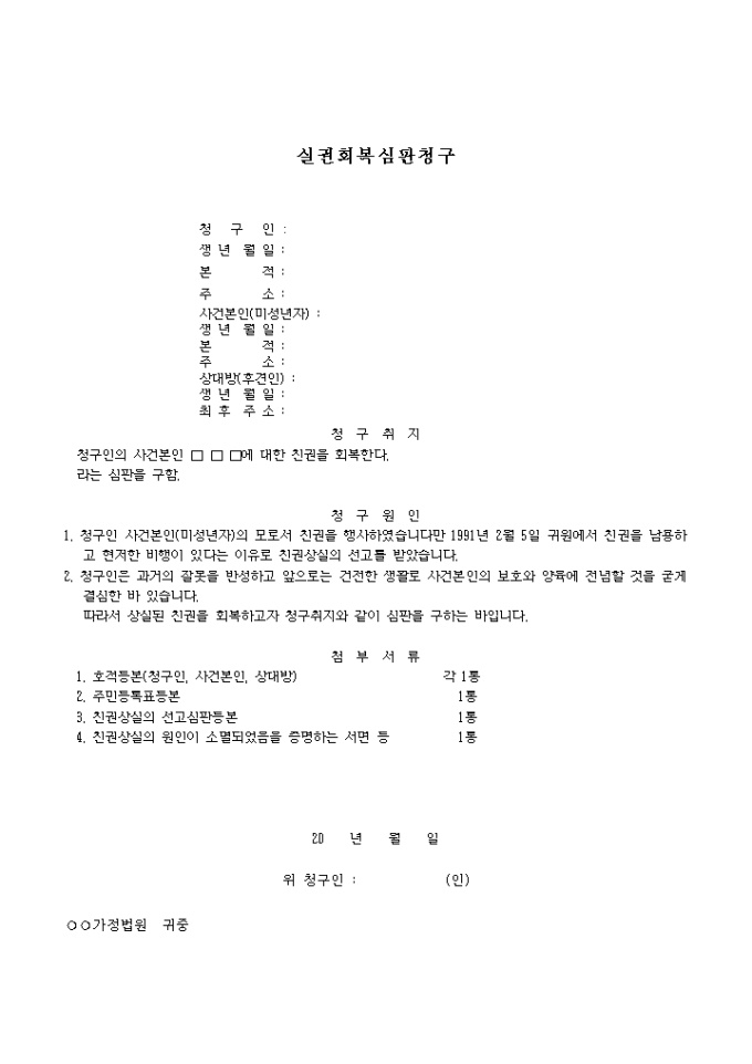 청구인의 사건본인에 대한 친권을 회복을 요청하는 청구서 양식입니다.