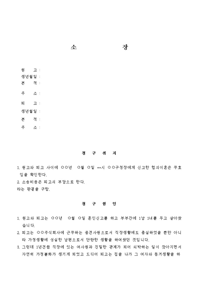 (이혼의사가 철회된 경우)원고와 피고 사이에 면장에게 신고하여 한 협의이혼은 무효임을 확인요청할 때 사용하는 양식입니다.