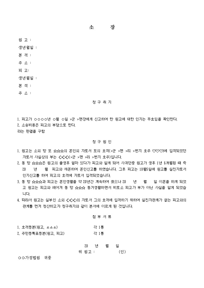 9,000원/월(피인지자가 인지자를 상대방으로 한 경우)피고가 면장에게 신고하여 한 원고에 대한 인지는 무효임을 확인요청할 때 사용하는 양식입니다.