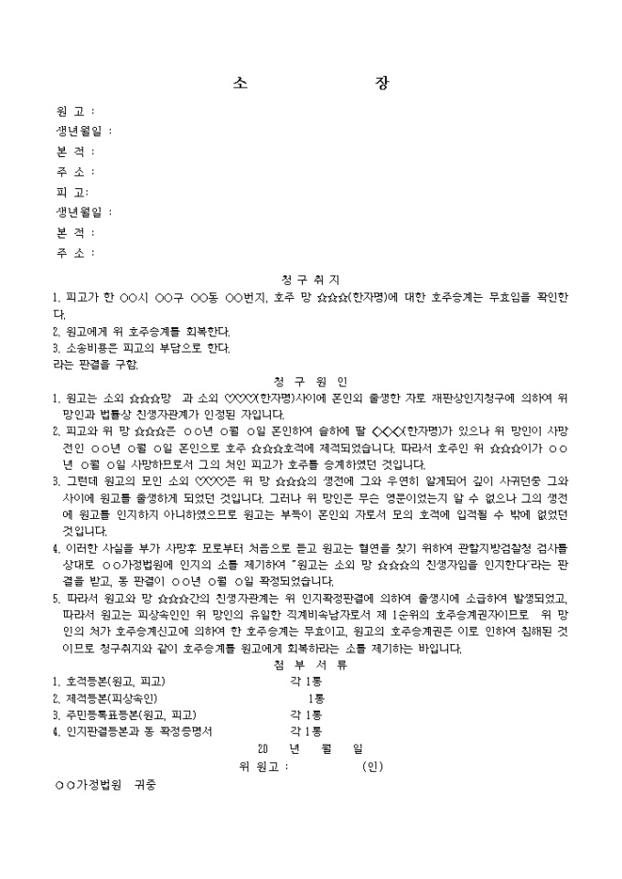 피고가 한 호주 망 ☆☆☆에 대한 호주승계는 무효임을 확인요청시 사용하는 소장양식입니다.